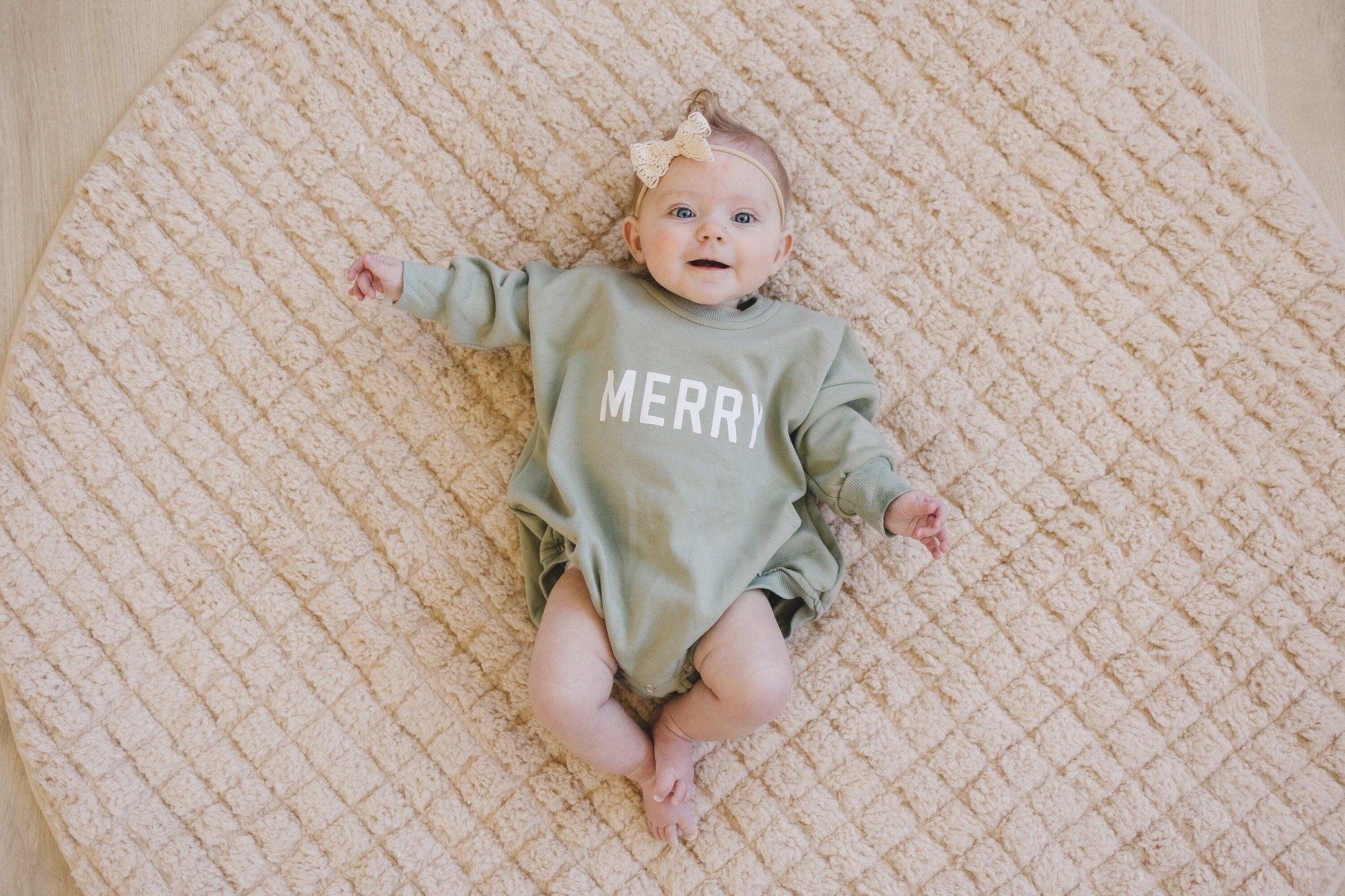 Merry graphic oversized sweatshirt romper with snaps at crotch. Lightweight terry material.